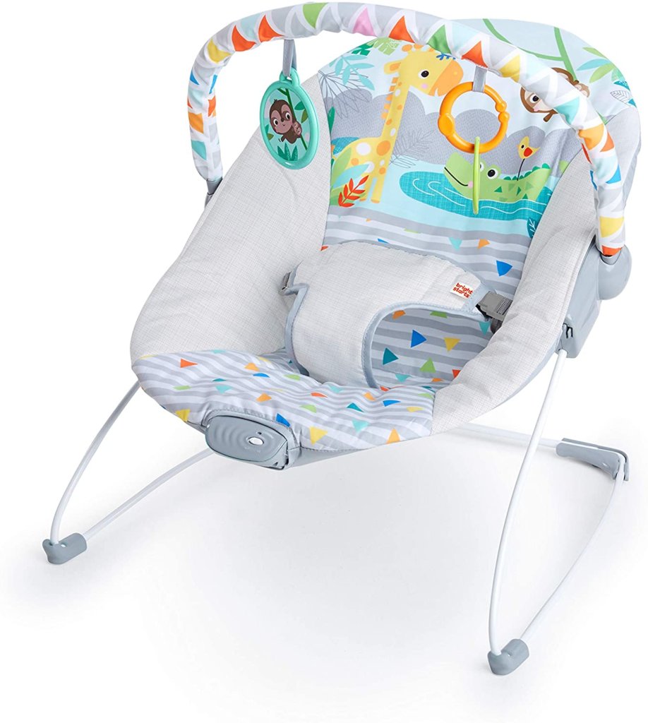 Entra na selva da alegria com esta espreguiçadeira da Bright Starts! Acalma o recém-nascido com a cadeira de embalar ou coloca-o numa posição fixa para as pequenas crianças. Quando se usa como cadeira de embalar para recém-nascido, o macaco oscilante e o brinquedo guizo entreterão o bebé.